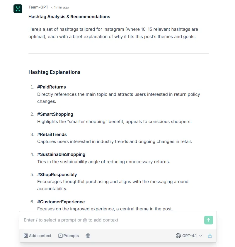 However, if you are looking to generate on-brand hashtags at scale, Team-GPT is the best choice.