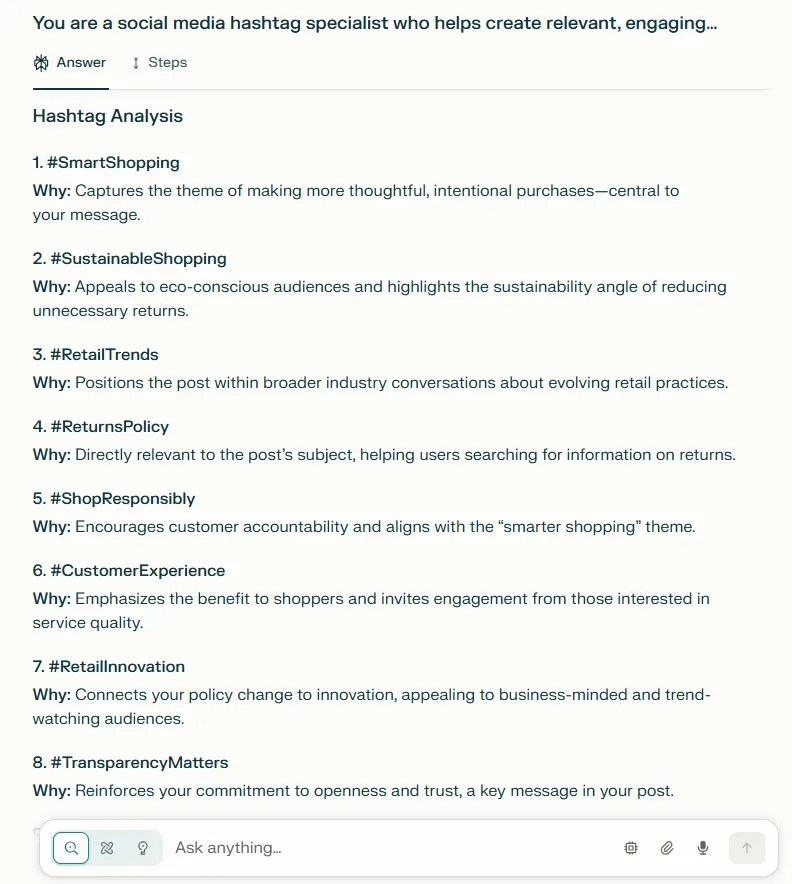 Perplexity offers a generative AI platform that lets you generate hashtags at scale after you provide it with as much context as possible.