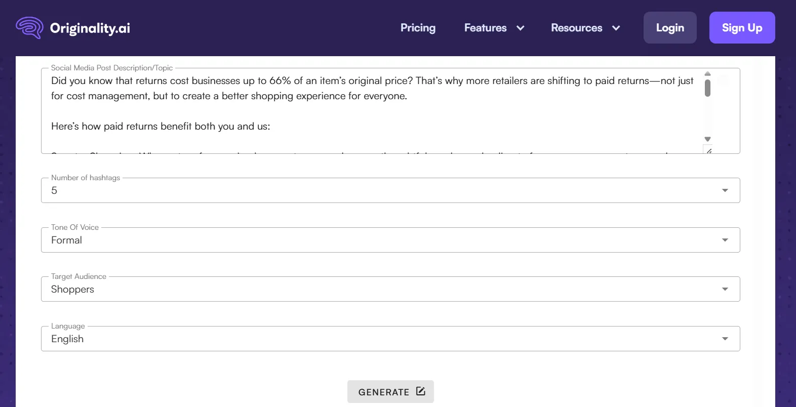 On the other hand, if you’re looking for a tool that asks for more information about your social media post, you can give Originality AI’s and Predis AI’s generators a chance.