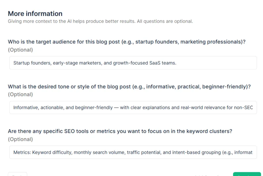You should have the ability to refine the results based on your specific needs, whether that’s adjusting the tone, target audience, or adding exclusions. The more control you have over the output, the better your keyword clusters will be for your goals.