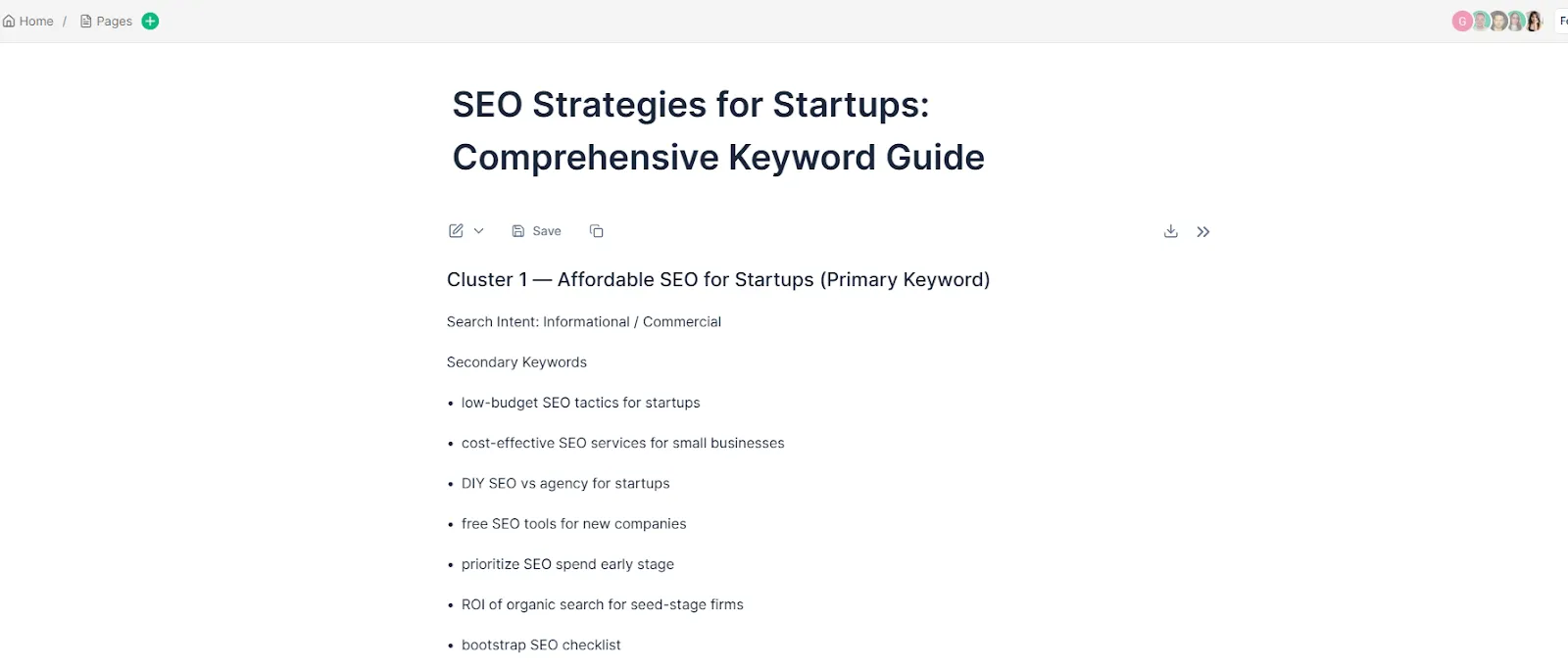 Once the keyword clusters are ready, I can click “Turn to Page” to turn the output into a clean, editable document, just like Google Docs. This makes it easy for me to edit, organize, and refine the clusters further. It’s super handy when I want to collaborate with my team or save clusters for future use.