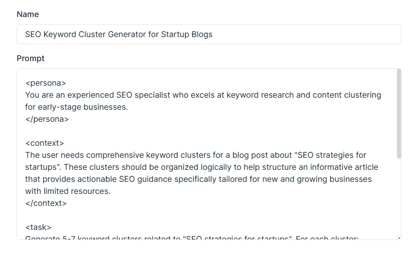 I start by defining the task I need to accomplish. For example, “generate keyword clusters for a blog post about “SEO strategies for startups”.