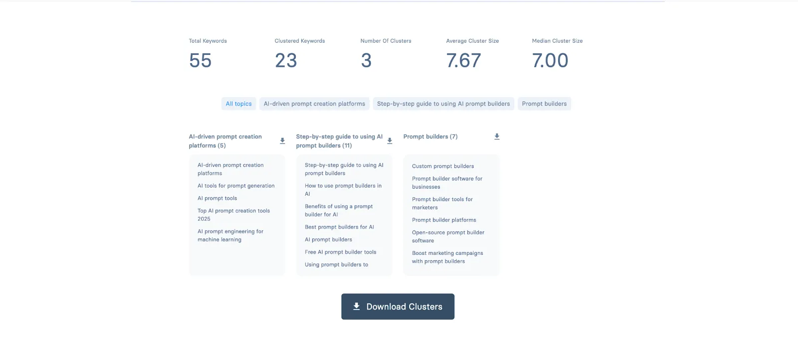 - Download the Clustered List: After the tool generates the clusters, I can hit the “Download Cluster List” button to export the organized keyword list for my content strategy or SEO plan.