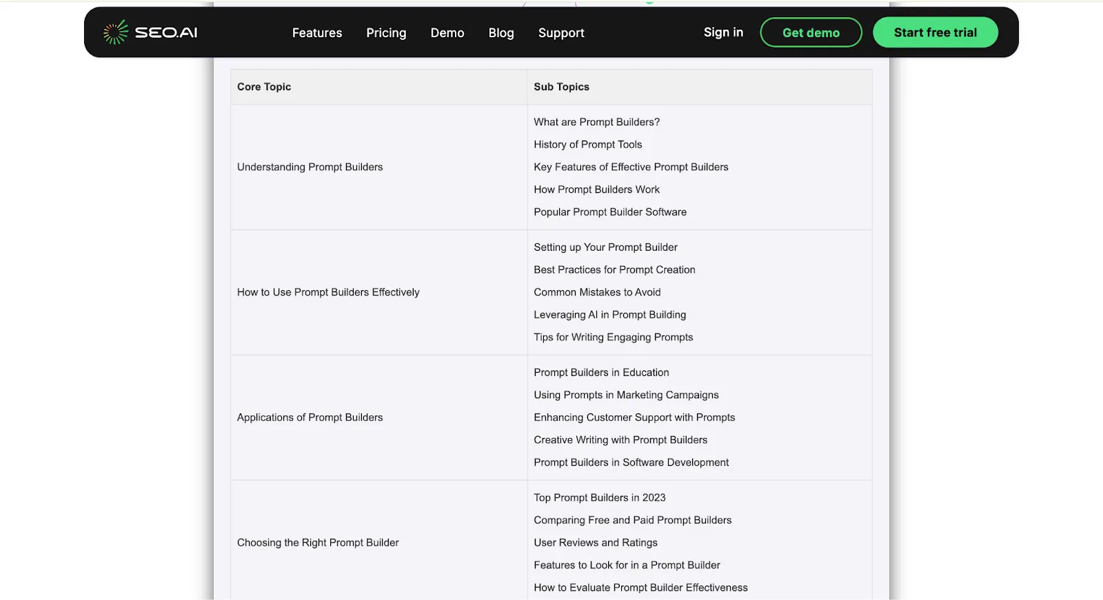 I used “prompt builders” as the primary keyword in SEO AI. Here’s what the tool generated for me: