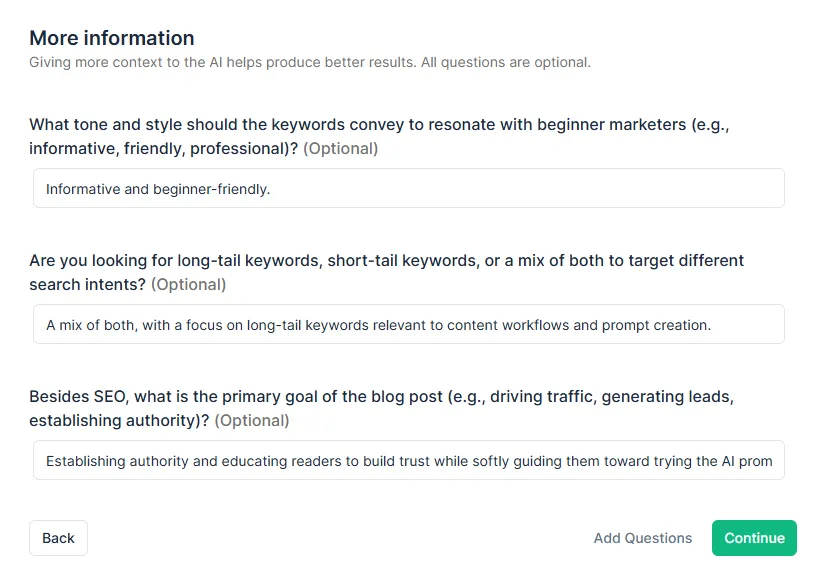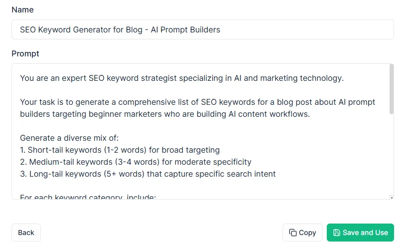 “I want to generate SEO keywords for a blog post about AI prompt builders. The target audience is beginner marketers building AI content workflows.”