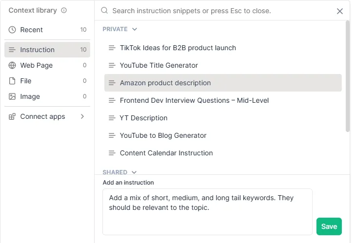 Here’s how I do it: I click on “Add Context” > “Instruction” > “Add an Instruction” > “Save”. I usually name it something like “SEO Keywords – Blog Content” or “Keyword Strategy for Marketing Blogs.”