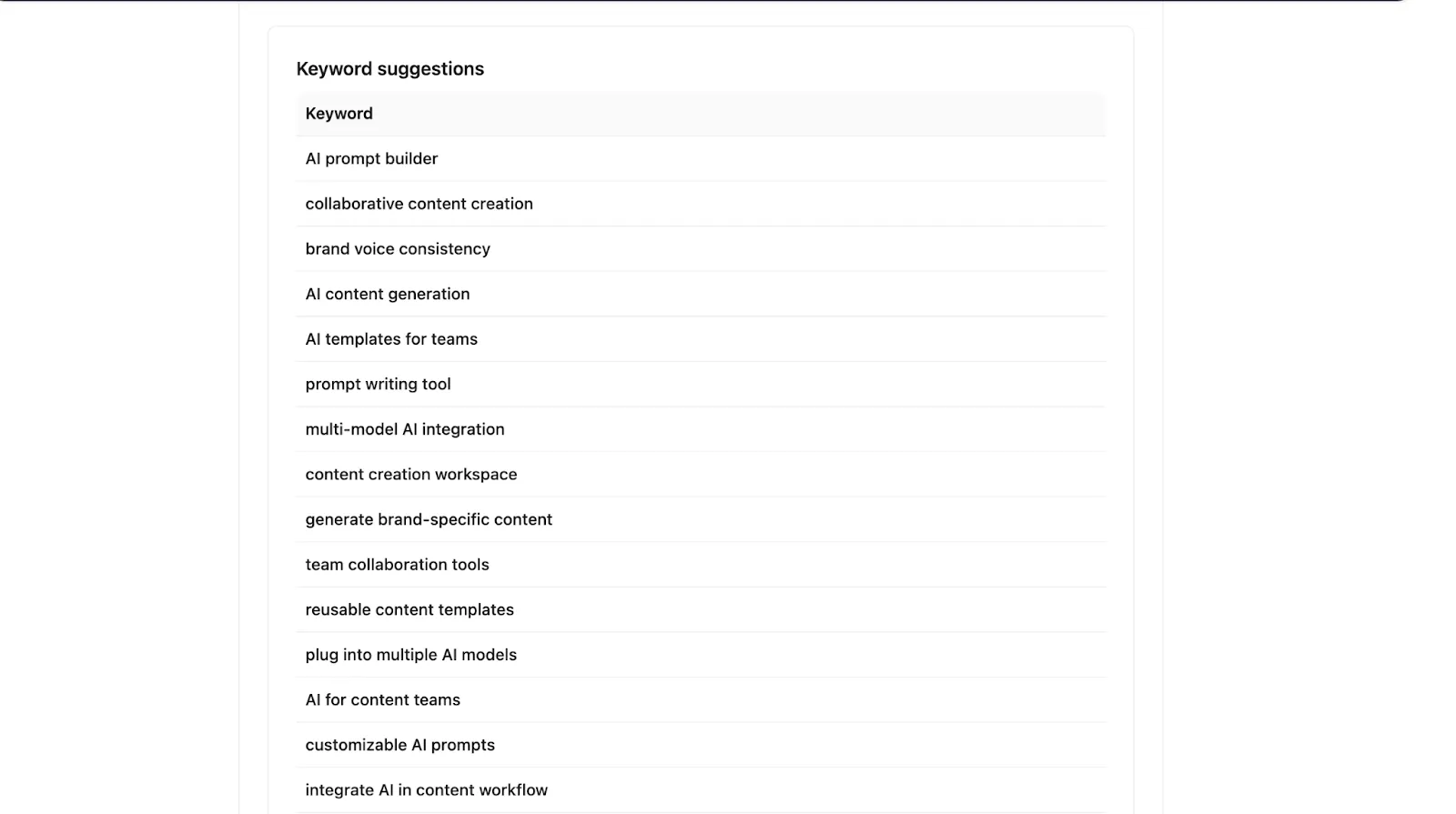 I used “prompt builders” and a brief description of Team-GPT as my input. Here are some of the keyword ideas SEO.AI gave me: