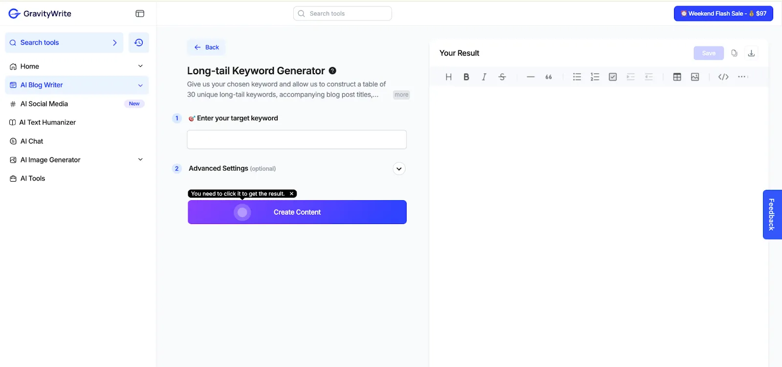 A good tool shouldn’t just ask you to “enter a keyword” and be done. You need the ability to shape the prompt so the results match your voice, target audience, and content format.
