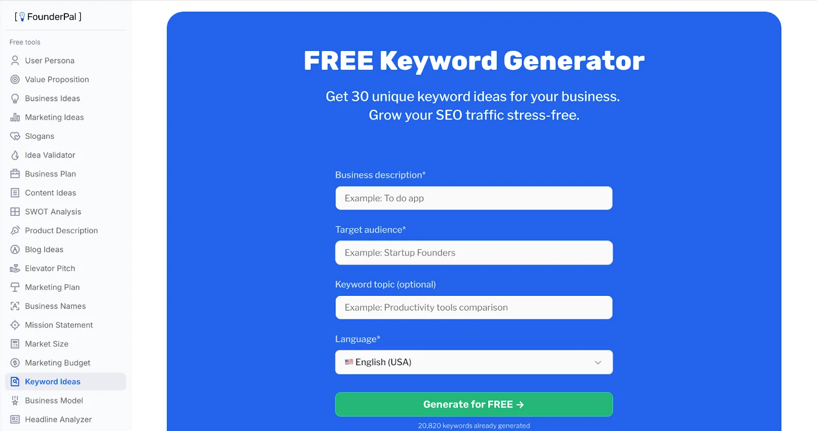 FounderPal keeps things simple, and that’s exactly why I like it. You don’t need to know SEO. You don’t need to set up anything complicated. Just describe your business in plain English, mention who you’re targeting, and hit generate.