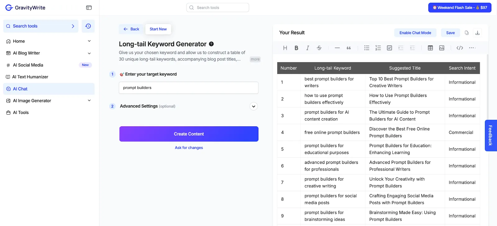 I used “prompt builders” as the primary keyword. Here are some of the ideas GravityWrite gave me: