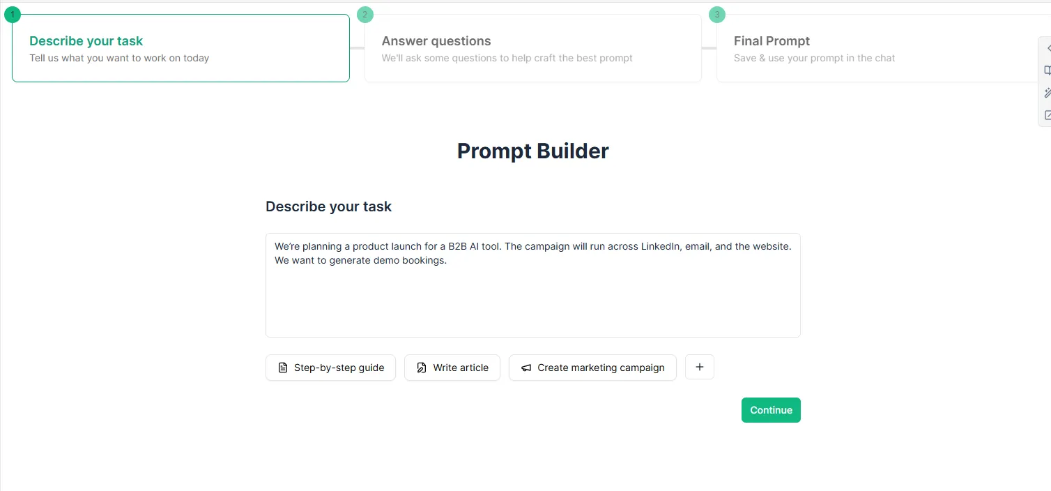 - Add Marketing Inputs: Mention your target market, positioning, tone of communication, and channels (LinkedIn, email, paid ads, etc.). If you have constraints like budget or internal resources, add that too.