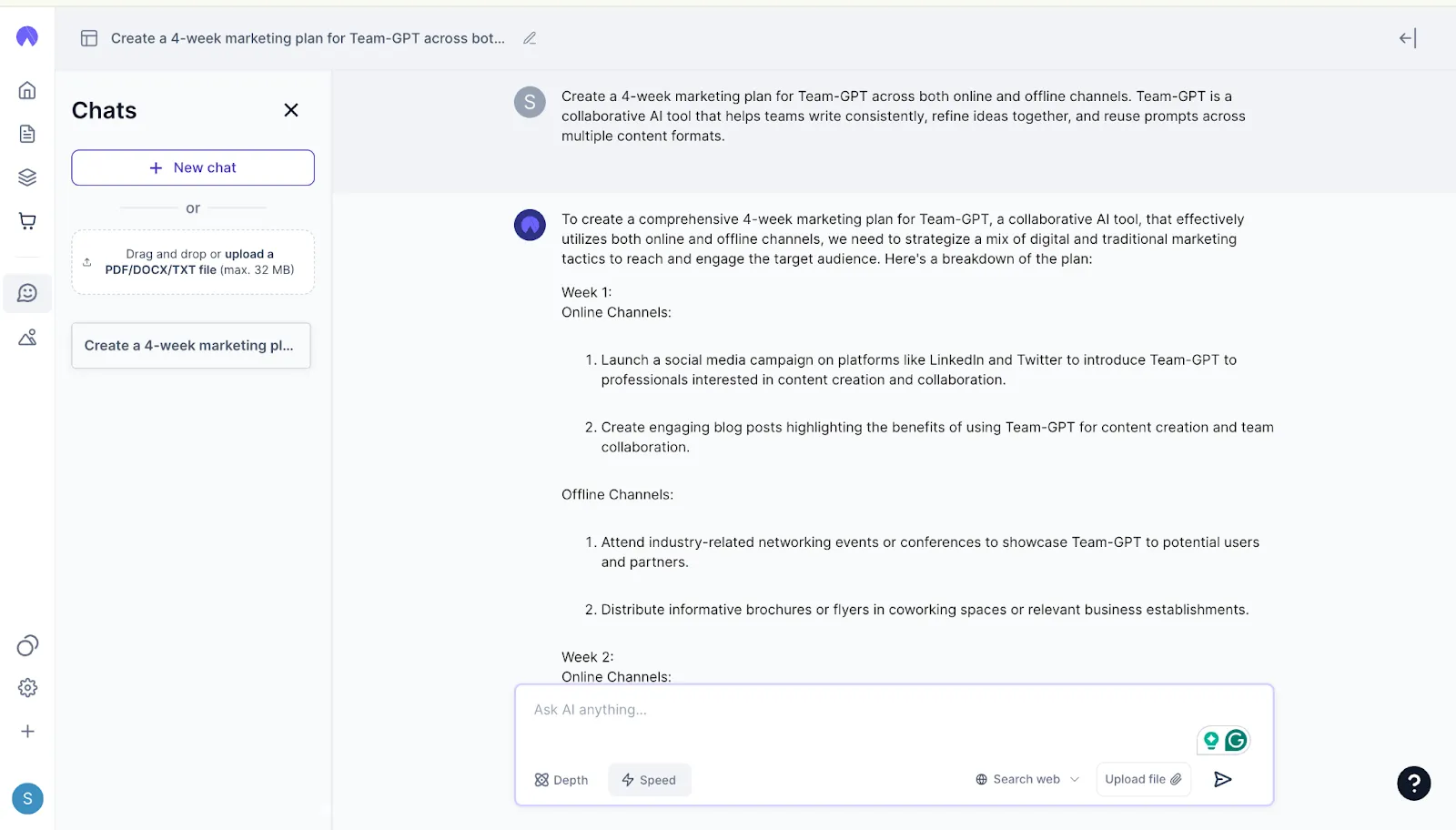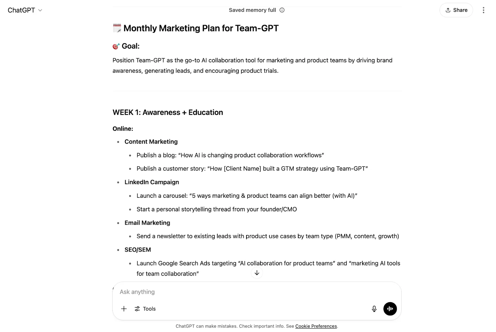 To test it, I created a monthly marketing plan for Team-GPT across both online and offline channels. Here’s what I got:
