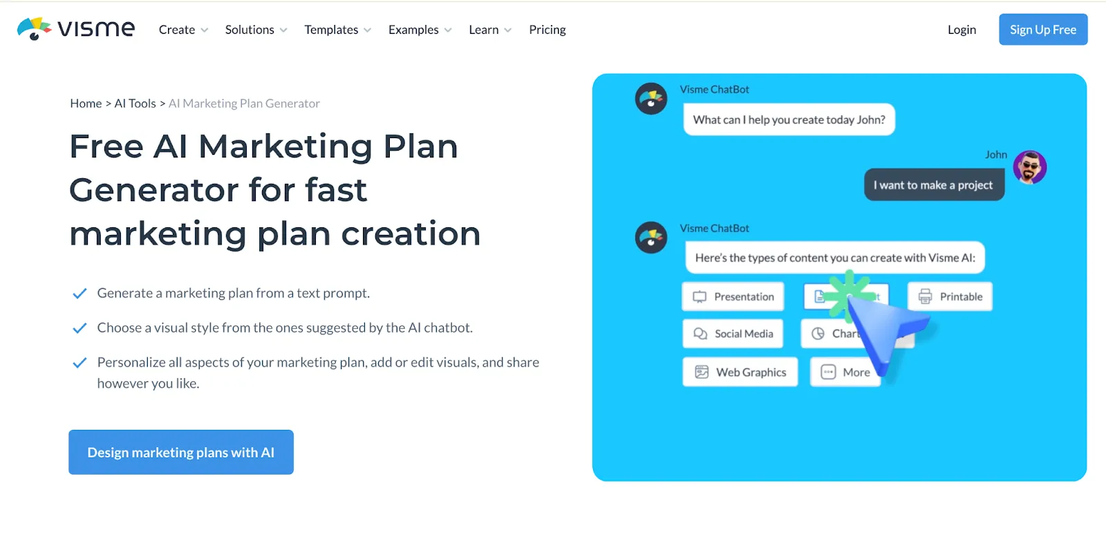 Visme stands out as one of the best AI marketing plan generators in 2025 for teams that care about both structure and design. Instead of just giving you a list of tasks or strategies, it helps you build a well-formatted, presentation-ready marketing plan from a simple prompt.