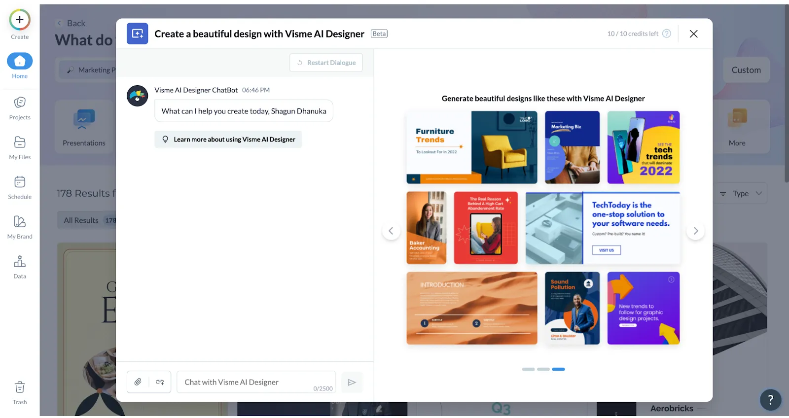 - Start a New Project: Log in to Visme and go to “Create New” → “Project” → “Generate with AI.” A chatbot window will open.