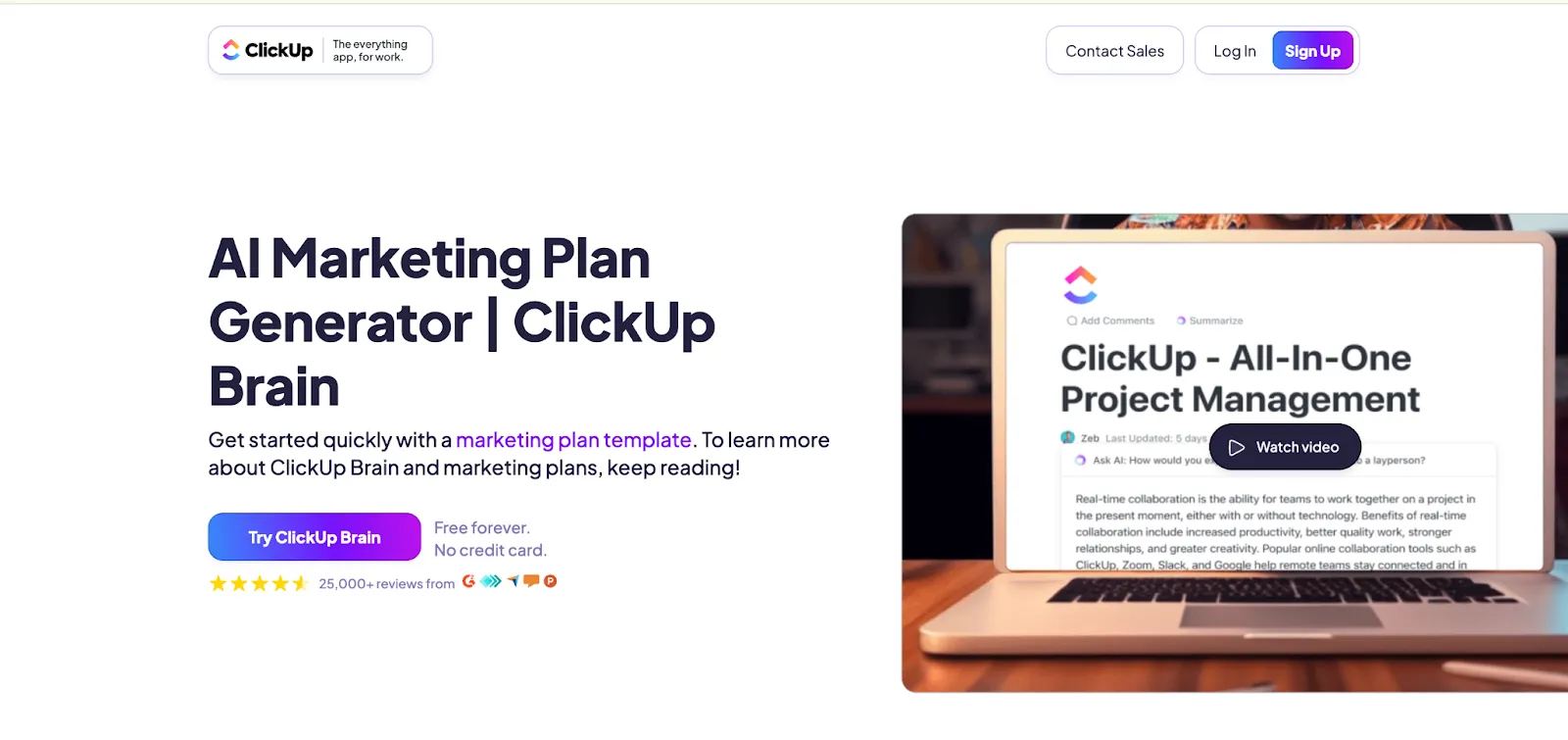 ClickUp is known for its project management features, but its AI-powered workspace, ClickUp Brain, makes it one of the most practical tools for building marketing plans. Whether you’re a startup founder, agency lead, or e-commerce manager, you can use it to create detailed, structured plans based on your business goals, timelines, and audience.