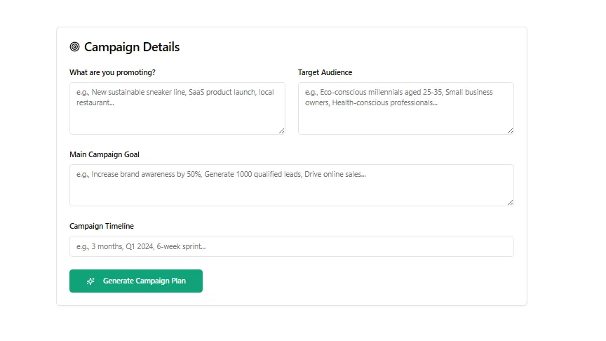 - A marketing plan generator, where your team can input your campaign details, target audience, campaign goals, and campaign timeline.