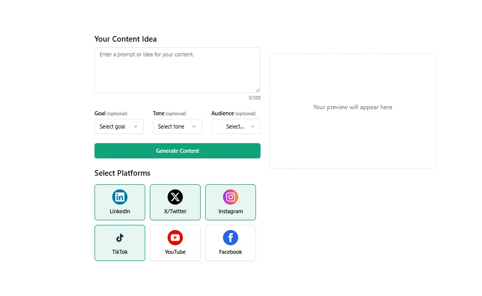- A social media post generator, where you can put your content idea, goal, tone, audience, and platform.