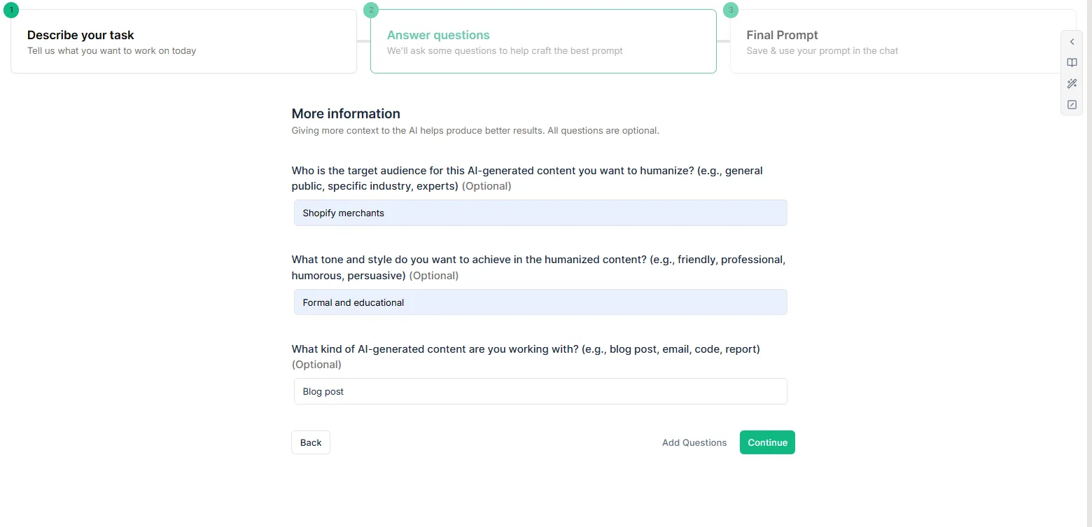 After that, our prompt builder will ask you to answer a few follow-up questions about the content that you want to humanize.