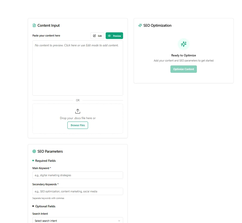 - SEO text optimizer that lets you put your content and then set the SEO parameters, such as the main keyword and search intent.