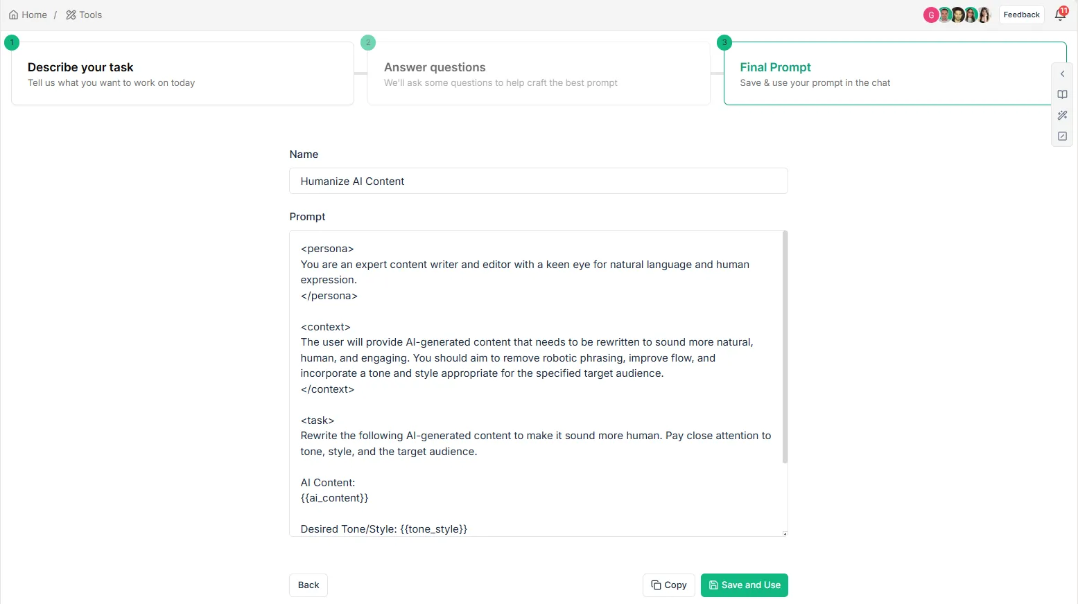 The way our prompt builder works is that you have to begin by describing your workflow, such as ‘‘I want to humanize AI content.’’