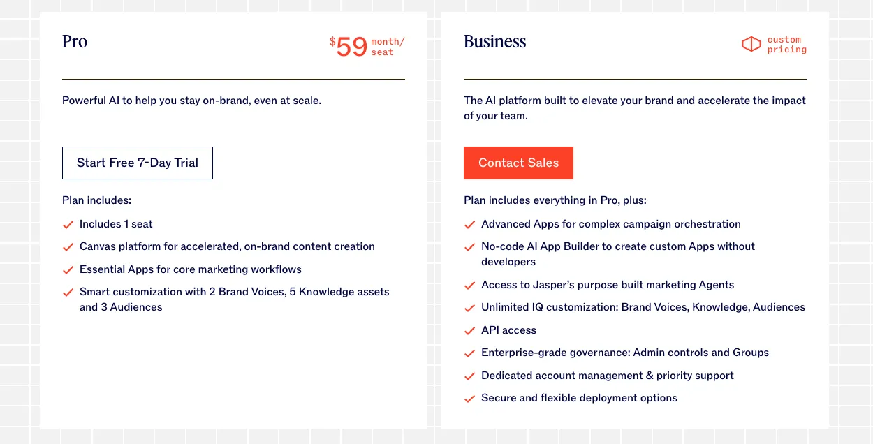 - Jasper AI focuses on on-brand marketing content creation across channels, with a Pro plan at $59/month per seat and custom pricing for Business.