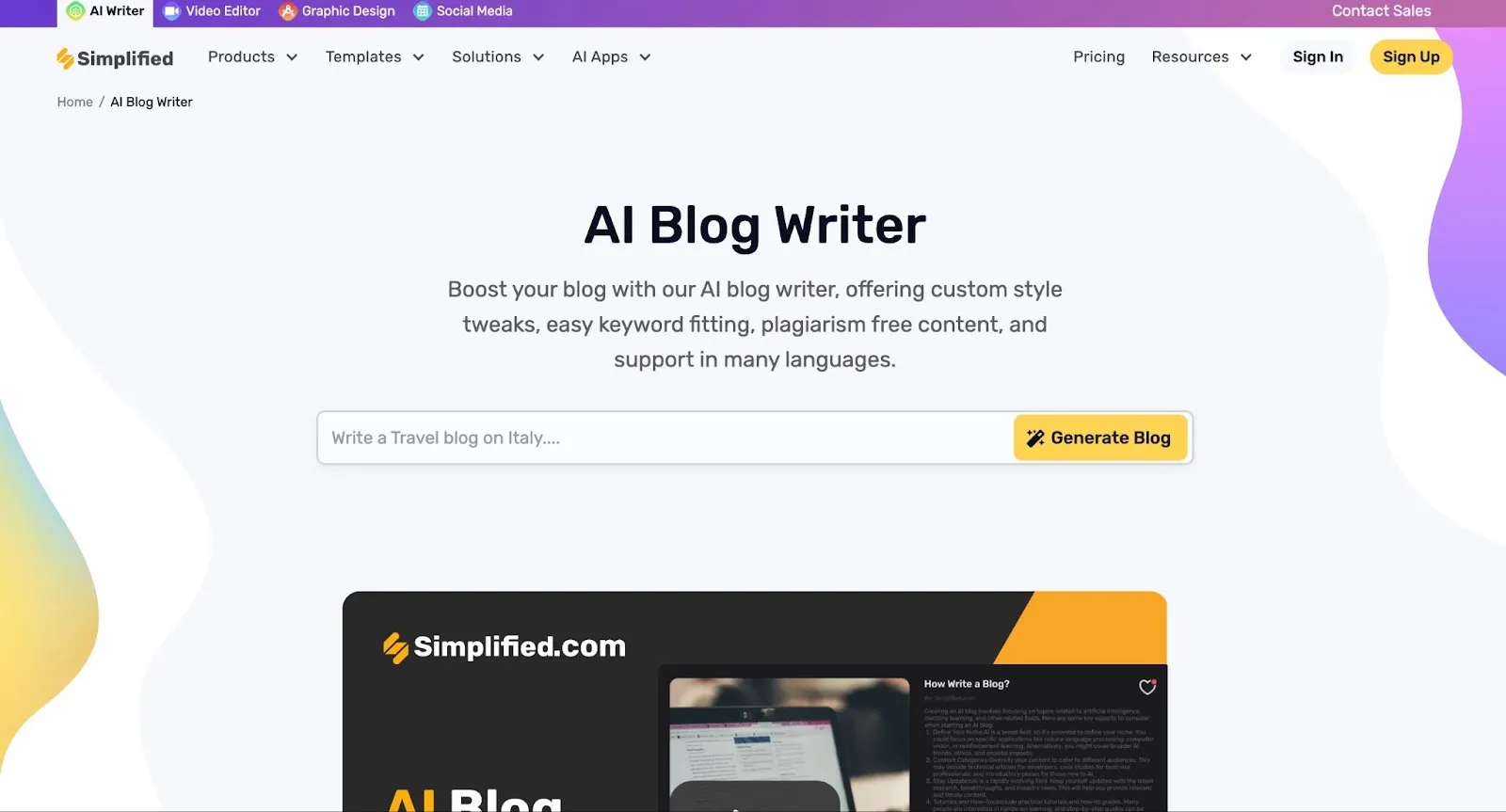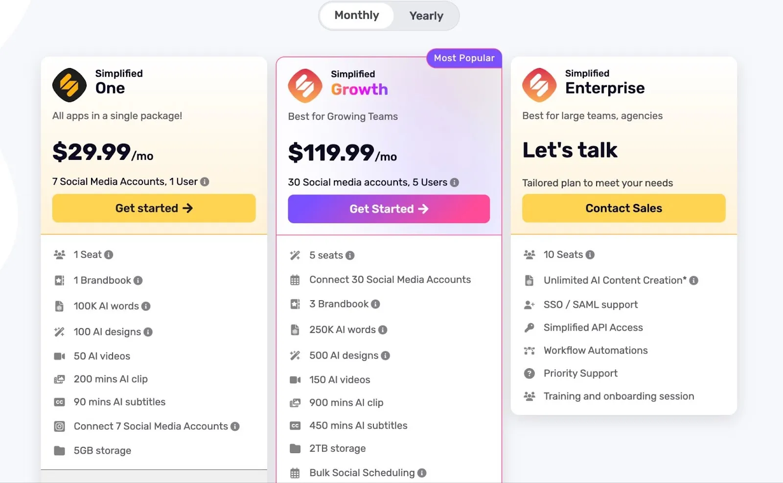 - Simplified offers an all-in-one content studio covering writing, design, video, and social scheduling, starting at $29.99/month and scaling to $119.99/month for teams.
