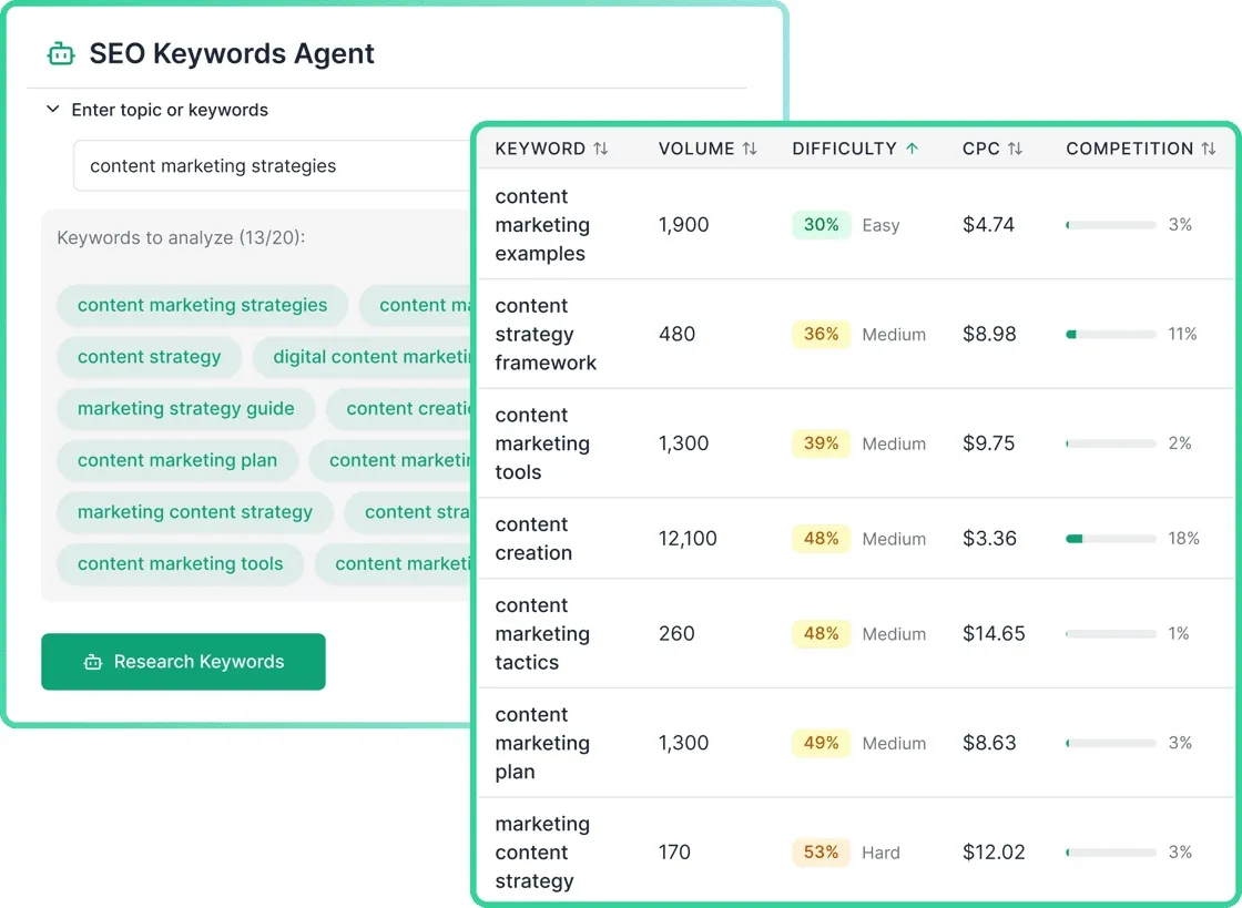 - SEO keyword research agent, where you can describe what topics you want to research or drop in specific keywords, and the agent will begin extracting relevant keywords with their search volume, difficulty, and level of competition.