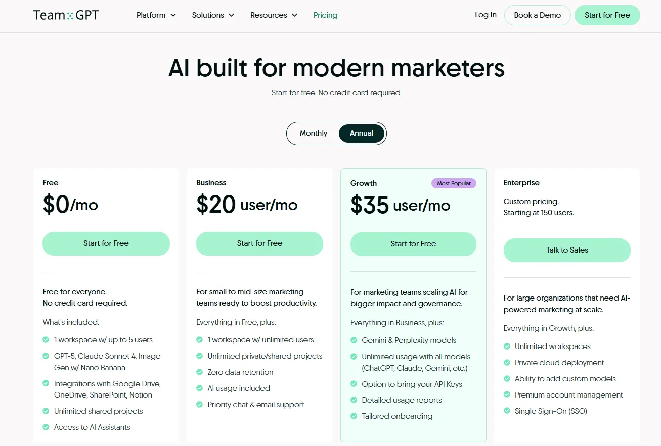 - Team-GPT provides a collaborative multi-model AI workspace with shared prompts, marketing mini-tools, and enterprise controls. Pricing starts with a free plan (up to 5 seats) and goes up to $20–$35/user/month for Business and Growth tiers, with enterprise options for 150+ users.
