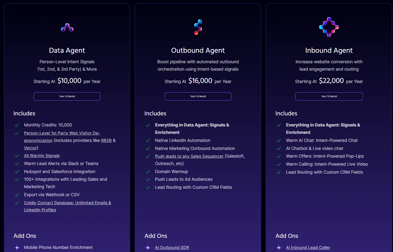 - Warmly specializes in intent-driven lead orchestration and website visitor de-anonymization, offering modular pricing from $10,000/year for its AI Data Agent up to $22,000/year+ for outbound orchestration.