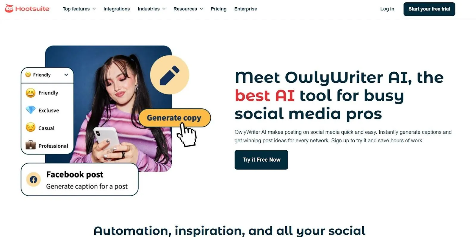 - OwlyWriter (Hootsuite) supports social content creation, captioning, and scheduling, available only within Hootsuite plans starting at $99/month.