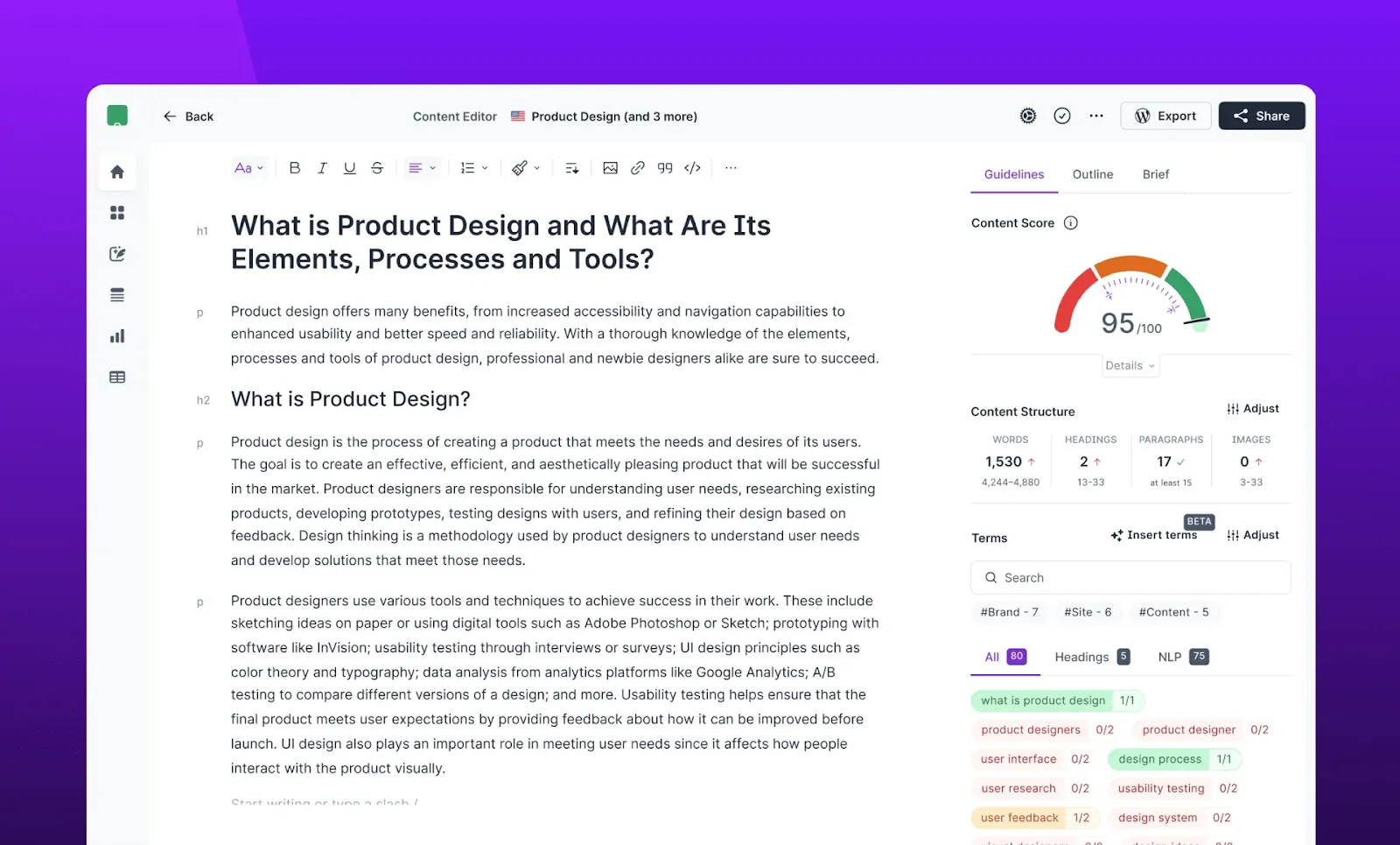 The platform takes care of the research, writing, and optimization of your article and can automatically add internal links to improve topical authority.