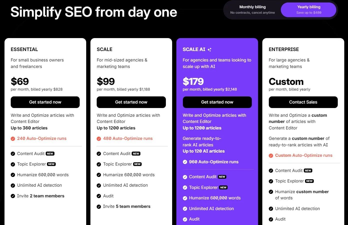 - Essential Plan: $69/month for two seats when paid annually, which gives you access to the tool’s Content Audit, unlimited AI detection, and the ability to humanize 600,000 words.