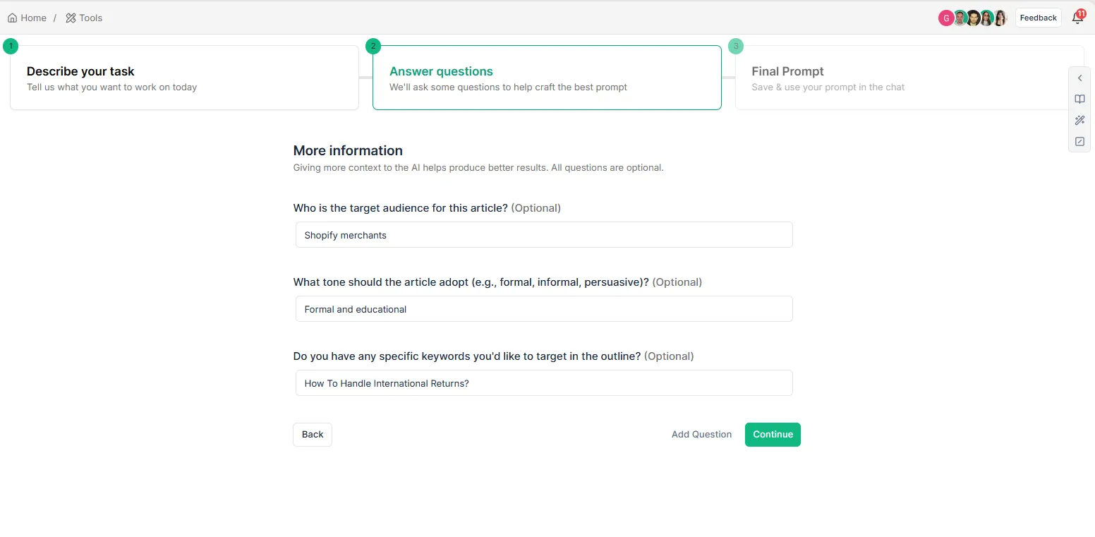 After that, our prompt builder will ask you to answer a few follow-up questions about the outline that you are looking to generate.