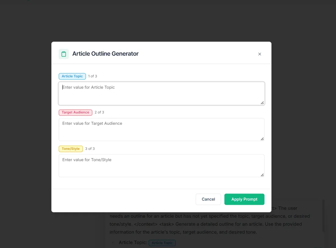 - A prompt builder, where you can build up your ideal prompt for outline generation.
