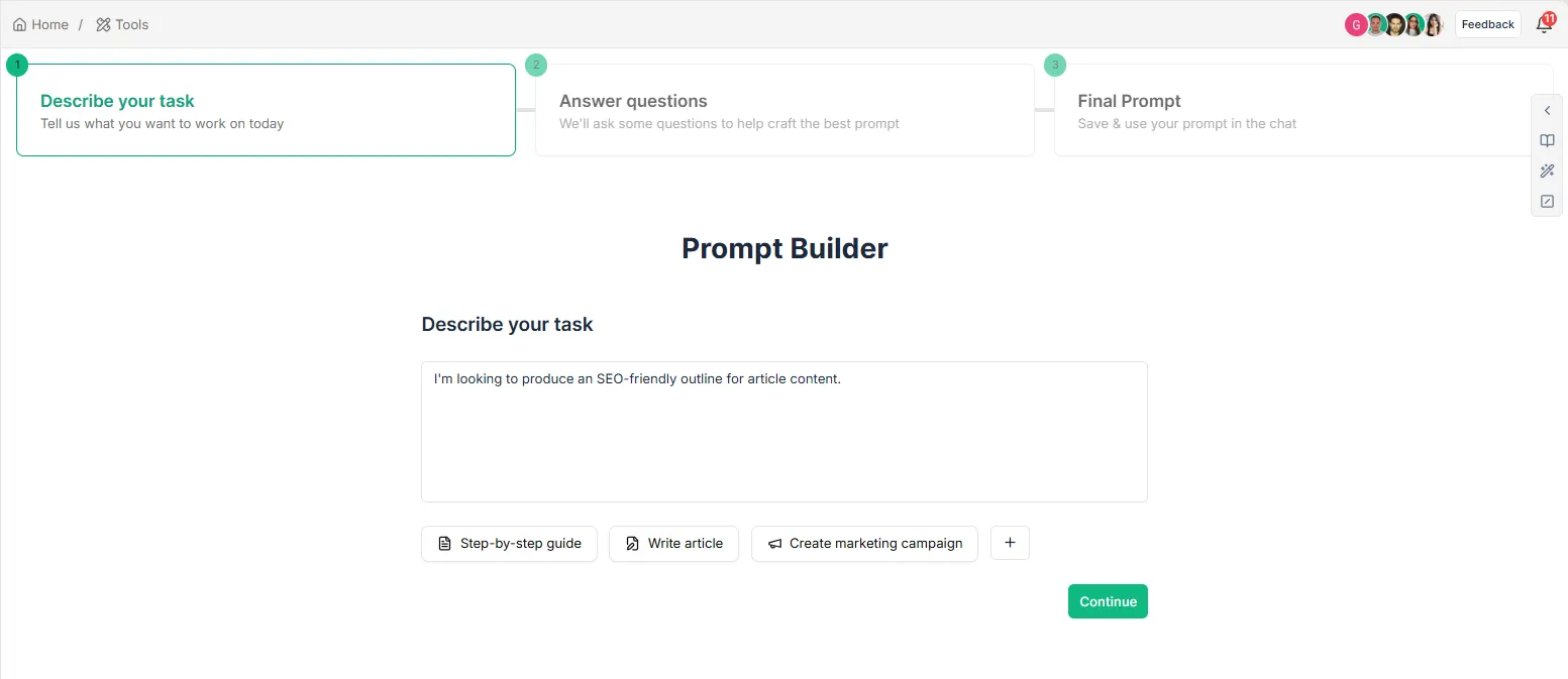 The way our prompt builder works is that you have to begin by describing your task, such as ‘’I’m looking to produce an SEO-friendly outline for article content’’ in my case.