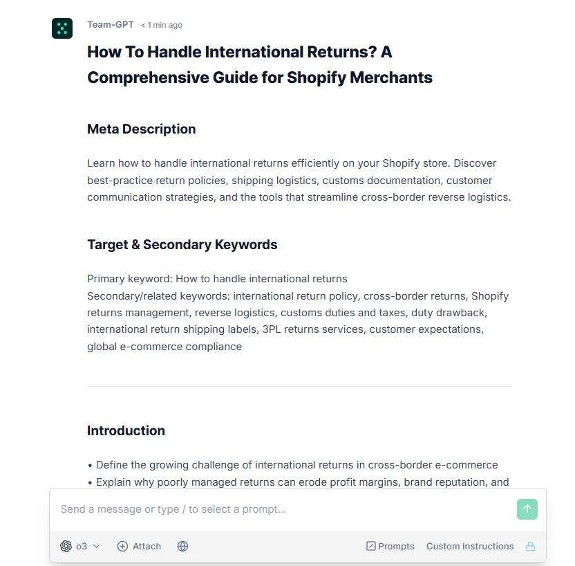 Here’s the final output that I was provided by Team-GPT after I provided it with my prompt: