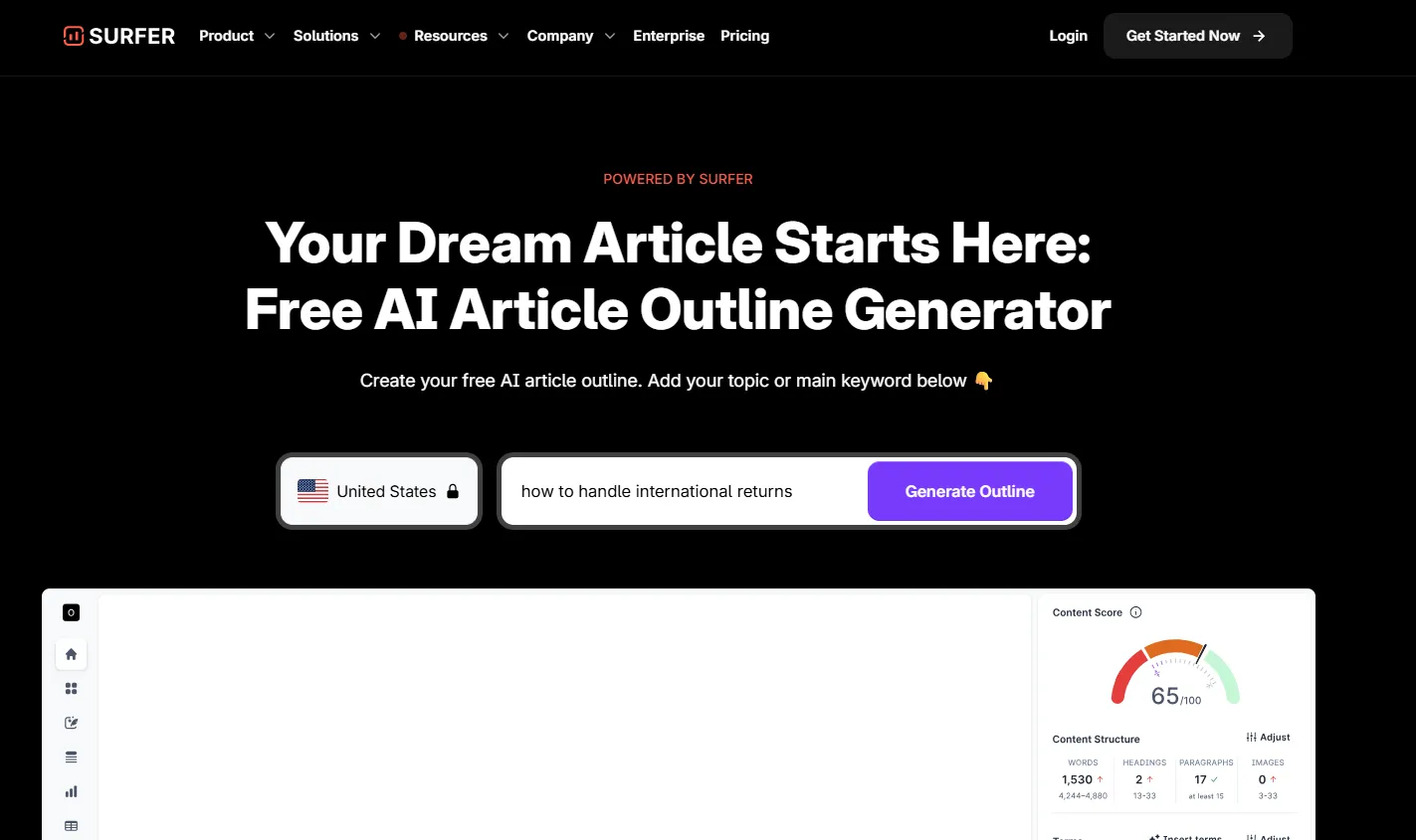 Surfer SEO is another AI-powered SEO tool that offers an outline generator, where you can select the topic of your article.