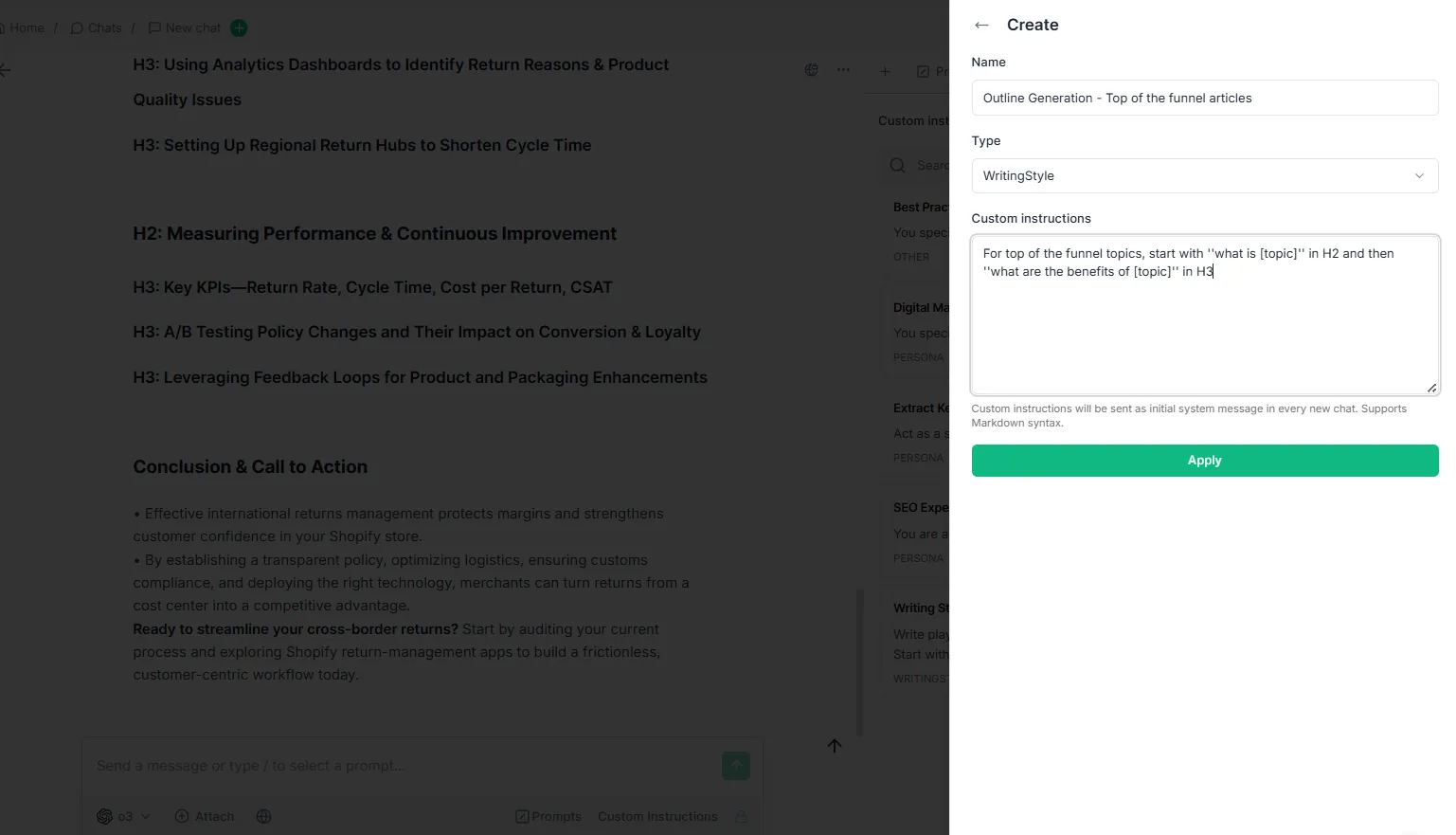 💡 Pro Tip: You can create custom instructions for the different types of content that you want to generate outlines for, such as top-of-the-funnel content or how-to guides.