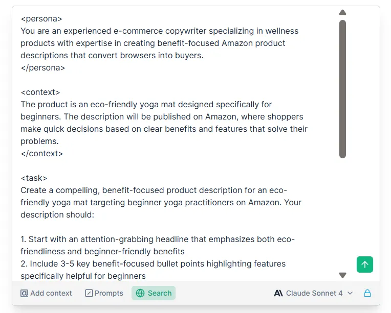 I wanted the output to be a bit shorter and optimized for Amazon SEO, so I added a quick line to guide it: