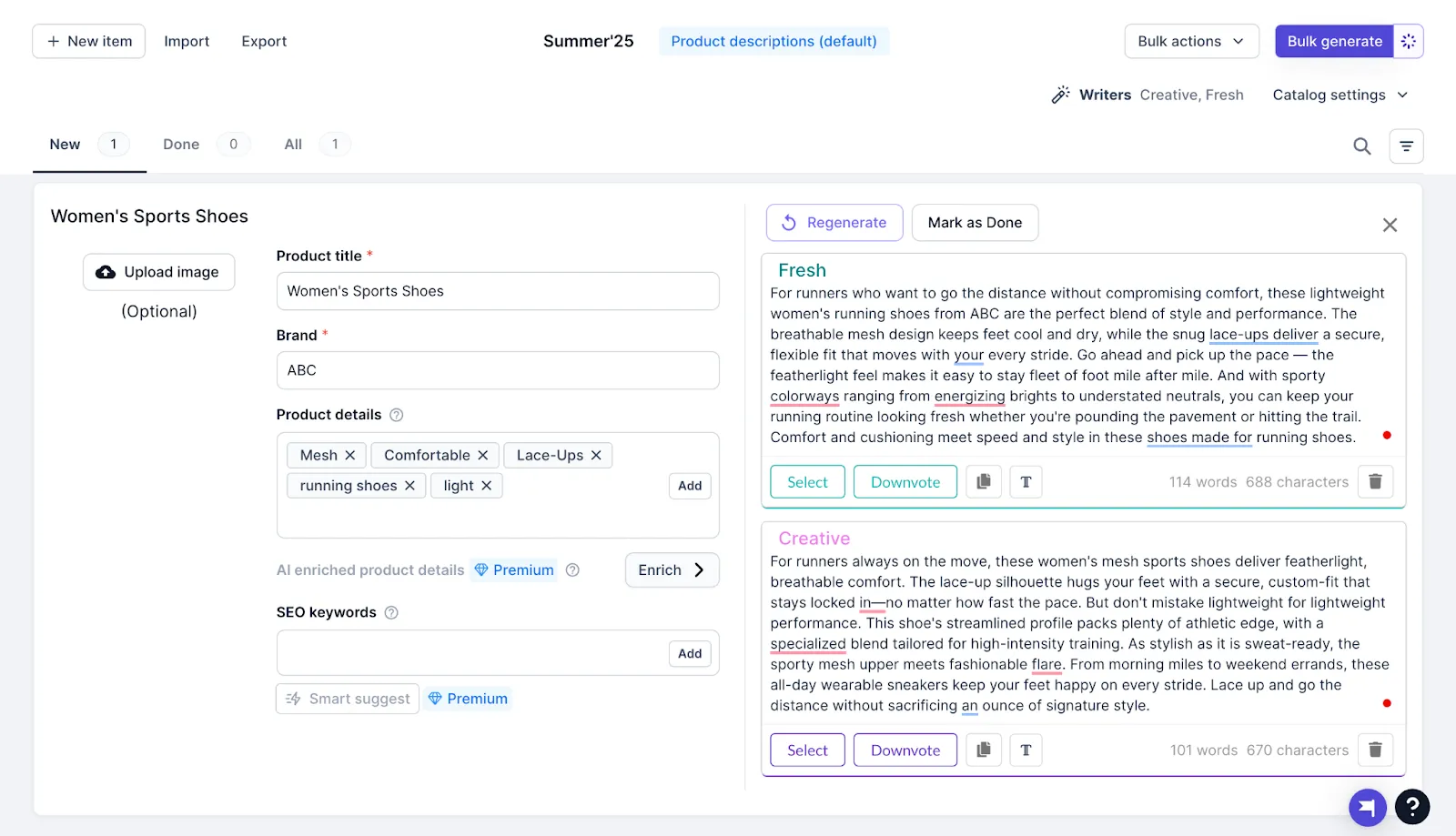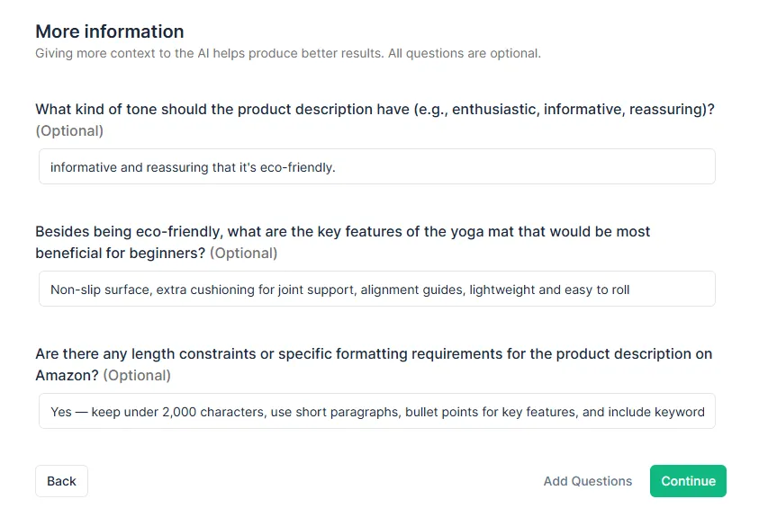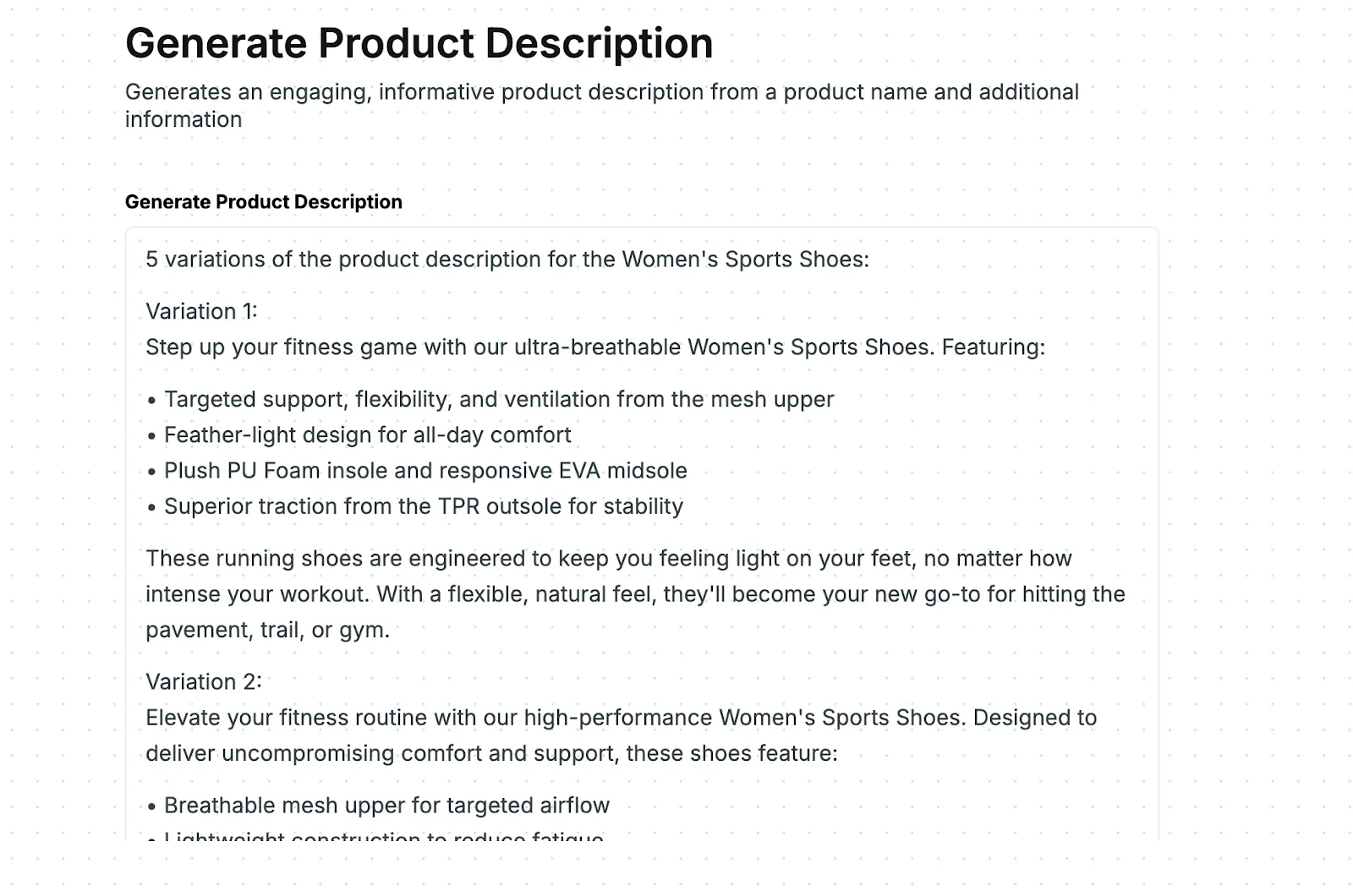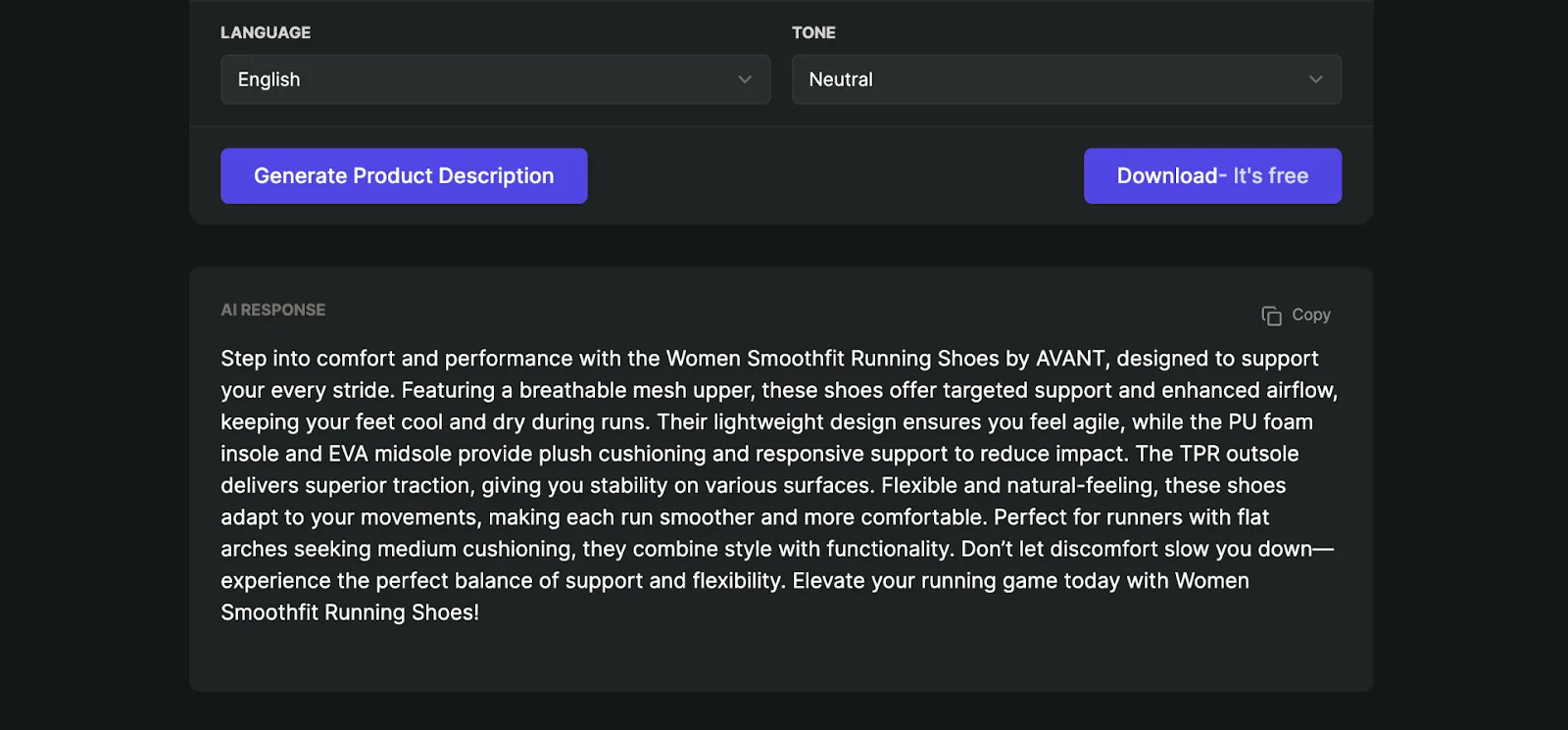 For example, if you’re selling shoes, you should be able to specify details like “cushioned sole,” “ideal for walking,” or “non-slip grip.” The more context you give, the better the output reads.