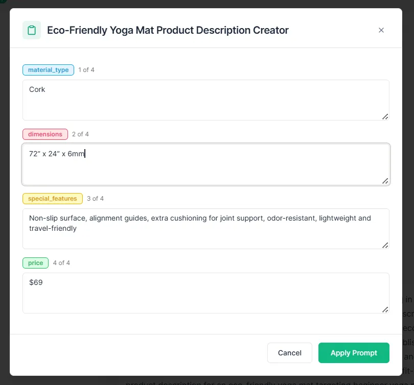 Look for tools that allow you to enter multiple features, benefits, tone, keywords, and target audience. This helps the AI understand the full context of your product, allowing it to generate copy that sounds like it was written specifically for that use case.