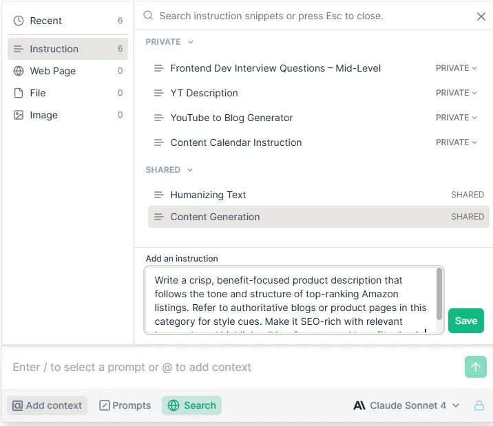 Even better, I can reuse and tweak those prompts across product ranges or categories. If I’m working on an entire product line or collaborating with a team, we can save what works, improve it together, and keep outputs consistent.
