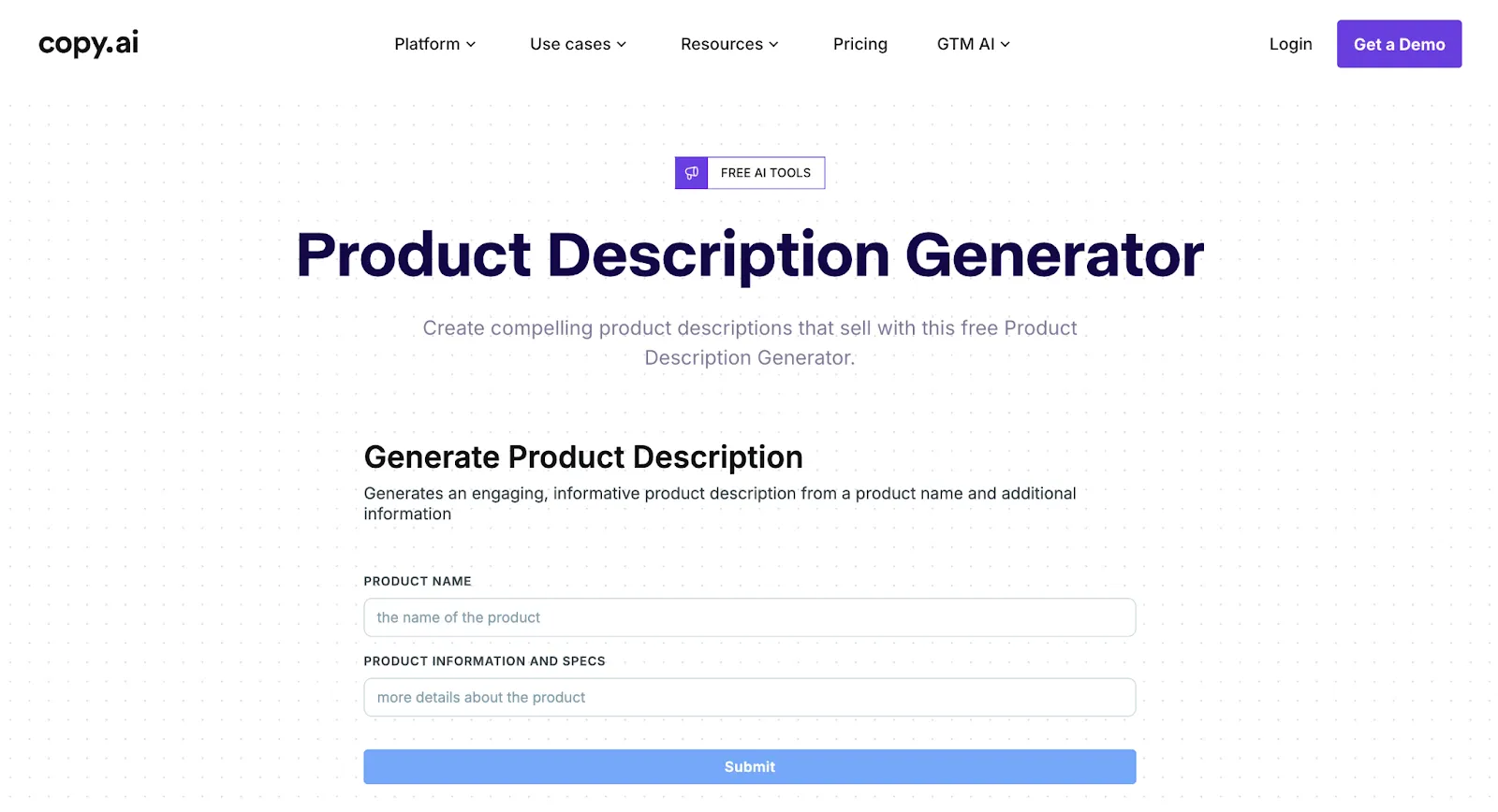 Copy.ai is one of the easiest tools to create clean, benefit-led product descriptions without starting from scratch. You simply enter a product name and a brief description or a list of features.