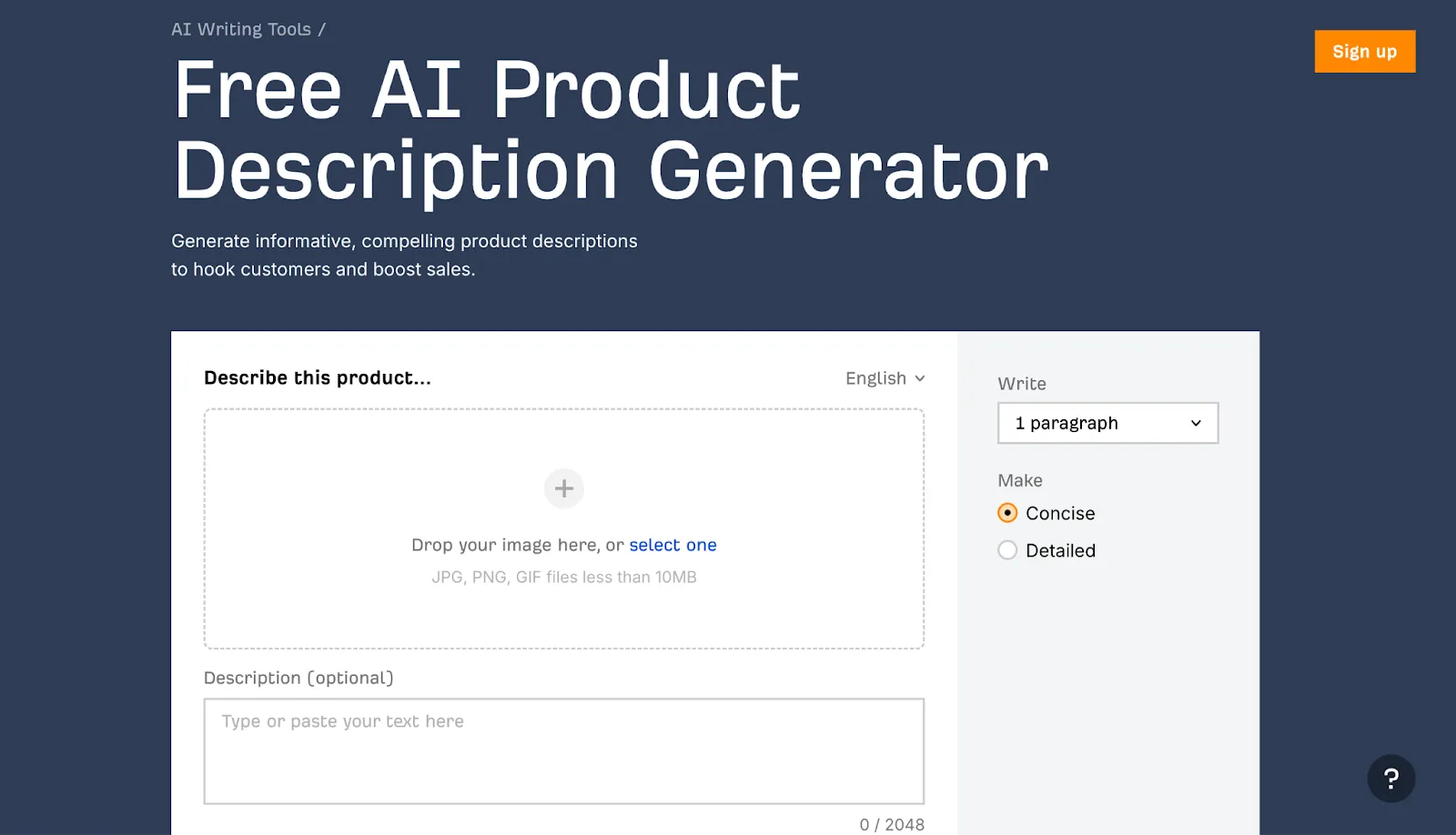 Writesonic offers a simple and free AI product description generator that helps you create SEO-ready, engaging product copy in seconds. It’s best suited for anyone who wants to add persuasive and consistent descriptions to online stores, without needing a copywriter.