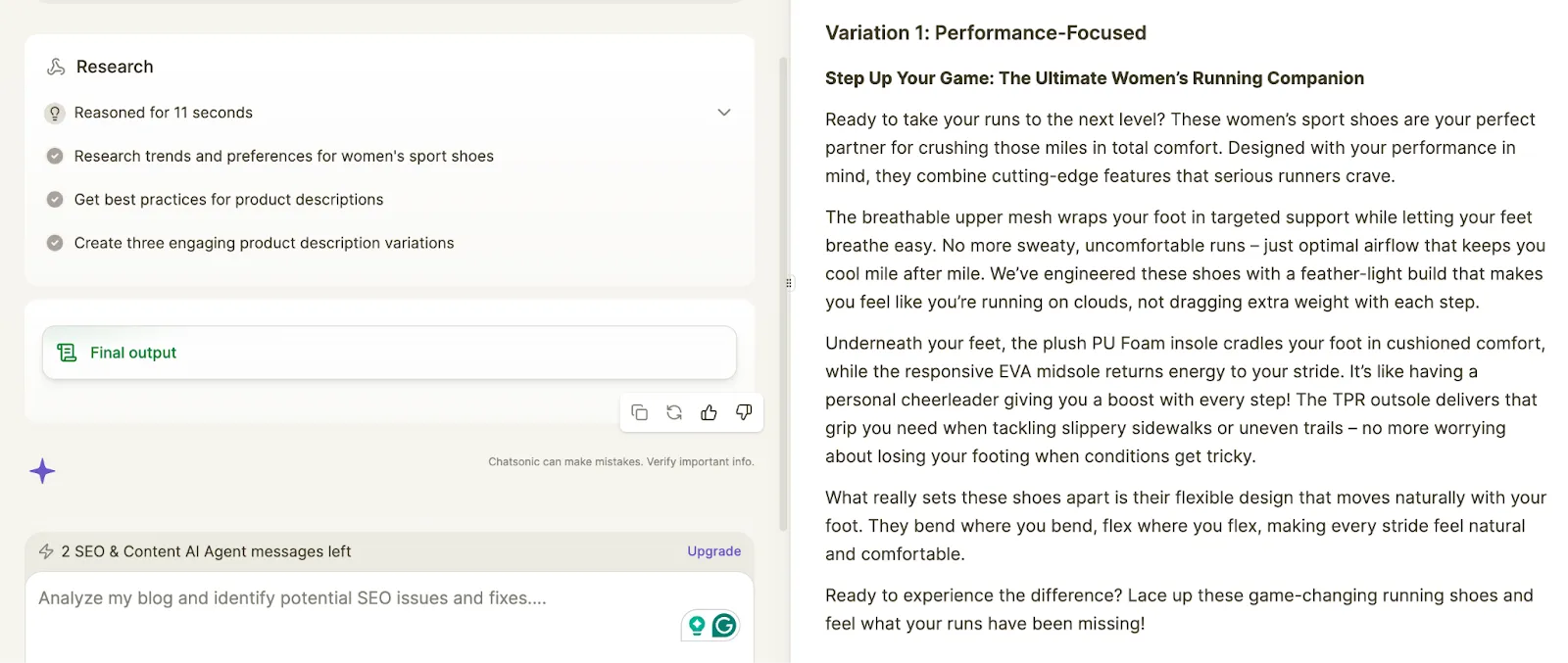 I tried generating an engaging and casual product description for women’s sports shoes on Writesonic. Here’s the output: