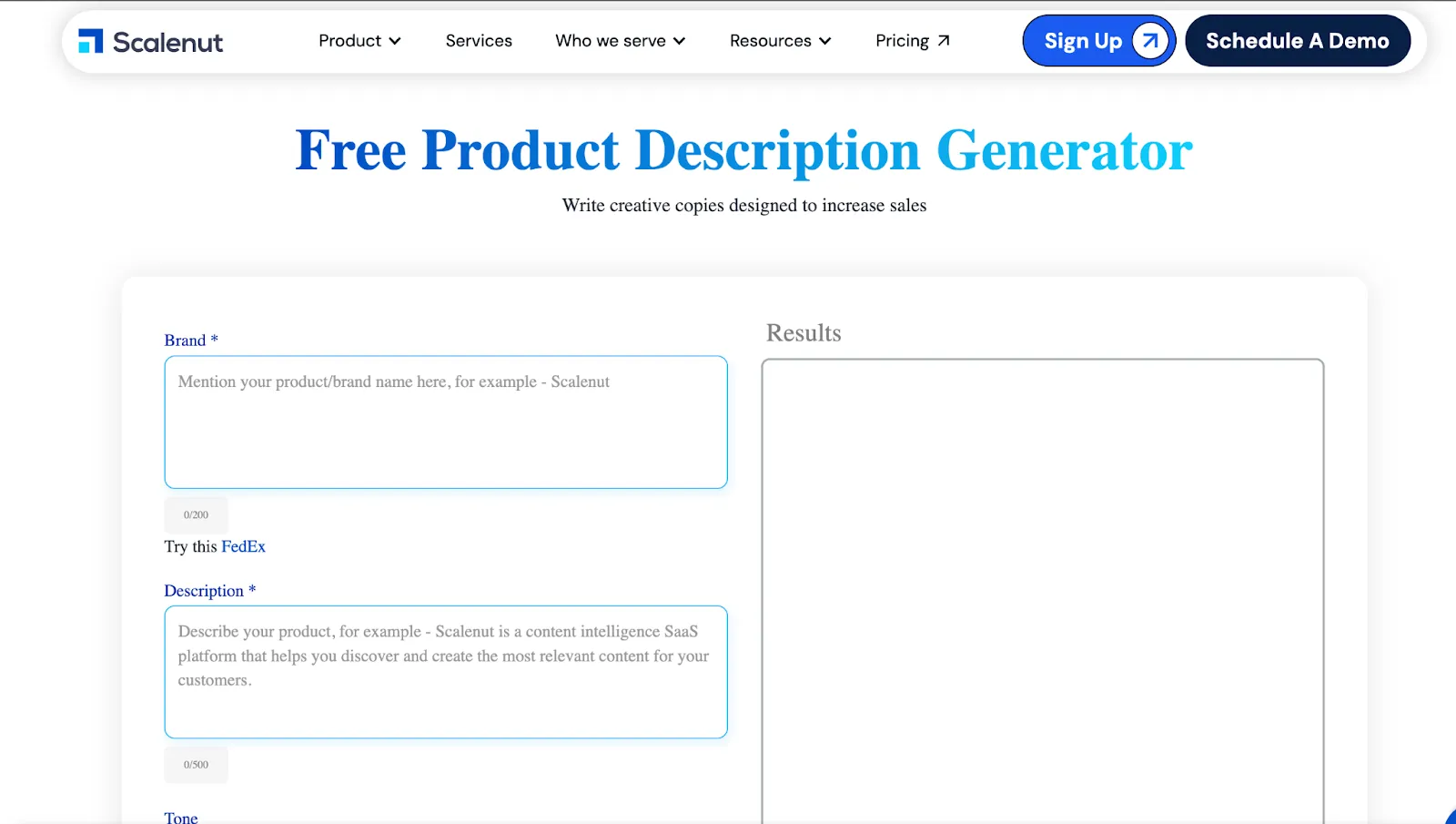 Scalenut offers a free AI-powered product description generator that helps you write clear, persuasive descriptions aligned with platform rules and SEO practices. You just add your brand name, a short product description, and tone—and the tool creates multiple unique outputs that highlight your product’s features and benefits.