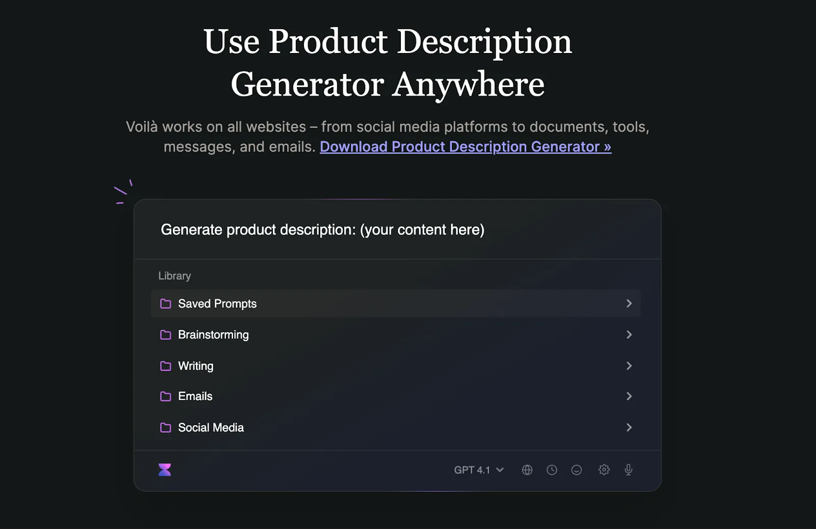 You just add a few product details, and Voilà gives you clear, ready-to-use descriptions. It works well across websites, e-commerce stores, and internal documents, making it a good choice for writing in various formats.