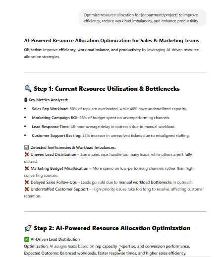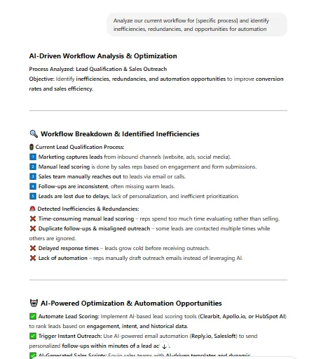 - Suggesting process improvements, such as automating approvals, integrating better tools, or redistributing workloads to maximize resource use.