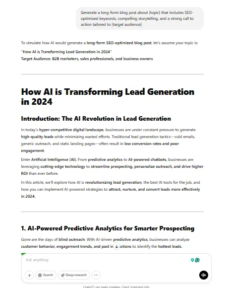 1. Generate a long-form blog post about [topic] that includes SEO-optimized keywords, compelling storytelling, and a strong call to action tailored to [target audience]