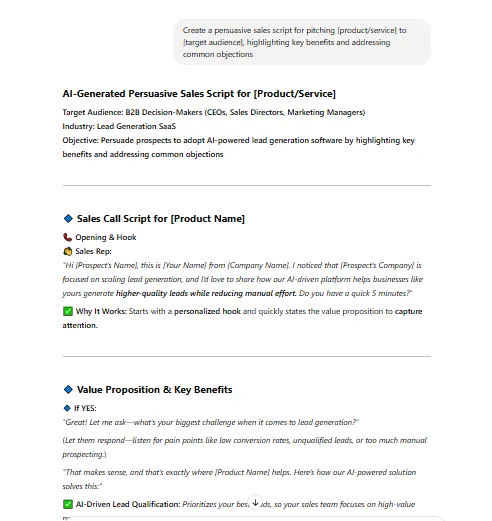 How it helps: AI generates structured, engaging sales scripts that ensure consistency and maximize persuasion.